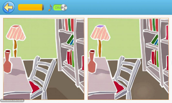 (让学生发现两幅图片的不同,有房书橱上书的数量以及灯顶部的颜色不同。)