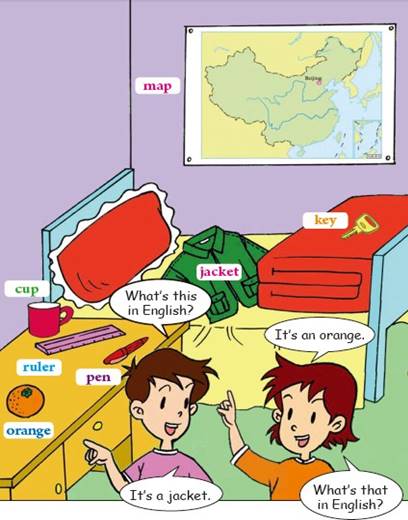 In this class, students mainly learn to talk about things around you with such patterns as “what’s this in English?”----It’s a/an… Listen and repeat the things. Have interest in learning English and learn to cooperate with others.