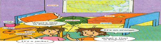 This is Cindy’s room. A map is on the wall. A jacket and a quilt are on the bed. A pen, a ruler and a cup are on the desk. A key is on the book. Look! What’s this in English? Oh, It’s an orange. Please spell it.