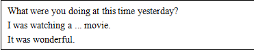 1. Focus their attention on the teacher. 2. Some pairs come to the platform to perform their conversations. Others correct their mistakes. 3. Of course, students can answer it’s about “Harry Potter”. 4. Listen to the tape. Students can hear “I was watching a Harry Potter movie”. 5. Enjoy the movie to feel the pronunciation. 6. Students listen to 1a again and underline some difficult sentences. |