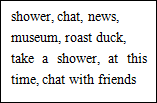 1. Write down “chat, news, museum, roast duck” on the blackboard. 2. Check the answers. Make sure students know the meaning of each word. 3. Teach the pronunciation by giving the phonetic symbols. 4. Ask students to read the example of 3 carefully. And make up a conversation like the example. 5. Invite some volunteers to practice. 6. Make sure almost all the students can change the example. Then give a question, “What were you doing at this time yesterday?” 7. Give students several minutes to practice. |