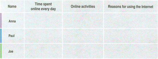 Step 3: Sam is doing a survey on online habits. He is now talking to his schoolmates Anna Paul, and Joe. Listen to the conversation and complete the following tasks.