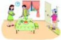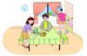 2学生仔细听录音理解,大概意思。 师生:拿出准备好的头饰 T: This is Liu Zhaoyang, and these are… Ss: Liu Zhaoyang’s mother and father. T: Yes, you are smart. Please say hello to them. 仔 仔细观察对话图片
