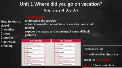 Ss are interested in Jane’s vacation and familiar with the simple features of diary. But it still difficult to master the difficult expressions with cooperation as well as it is hard to arouse the interest to keep diaries. How to design teaching procedures to balance the ability improving and knowledge mastering is a problem I need to think about. And I also should think about how to elicit Ss to write diaries and love writing. |
