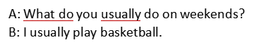 6) List these indefinite frequency adverbs according to percentage beside the axis. 7) Students are divided into several groups to discuss the task given by teacher. After their discussion, some of them can share their answer, others can express their different opinions. 8) Give more sentences like the structure of “What do you usually do on weekends?”. 9) Have a discussion in groups. |