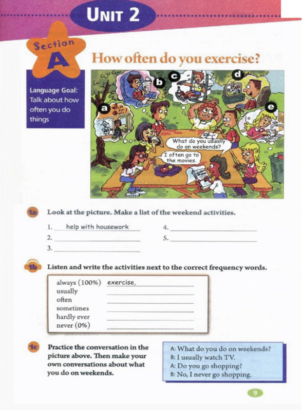 1) Think and write their answer. 2) Observe the list of definite frequency adverbs, try to summary some principles. 3) Use what they got in step 2 to create some new phrases. 4) Listen to the tape carefully, and number the activities [1-5] in the order according to the tape. 5) Think about what are indefinite frequency adverbs, and underline them in the short passage. |