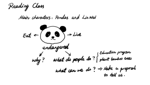 Ss are familiar with the character (pandas) of the reading material, and are very interested in the topic (How to protect pandas?), but they are unfamiliar with proposal writing. So it’s necessary for me to spare a bit more time in the writing part, list some example sentences maybe a good choice.