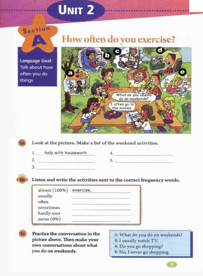 1.learn the new words and phrases 2.talk about what they do and how often do they exercise 3.self-assessment |