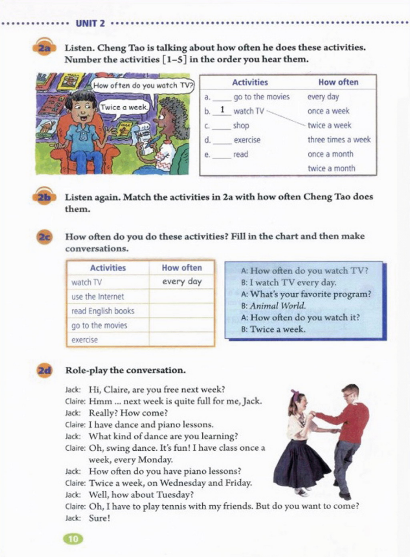 1.play the recording of the task one, and teach students a skill that they can only write parts of the answer at first 2.organize a pair work and invite two or three groups of students to present 3.teach something about the adverbial phrases of frequency 4.play the recording of the task two and three 5.organize a pair work and invite several students to present |