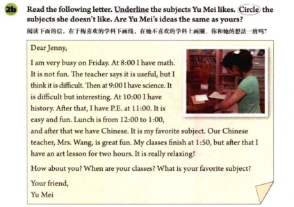 本 课 教 学 内 容 选自人教版教材 七年级上册unit 9 My favorite subject is science 第 二 课 时 的 阅 读 文 本 A letter about the subjects Yu Mei likes。