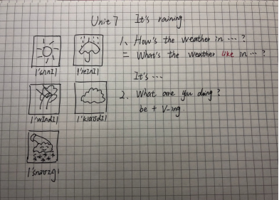 谈论天气与我们的日常生活有关,加以图画、视频相配合,学习起来会比较直观、易接受。所以在掌握天气相关的形容词,动词显得更为重要。首先,教师应该通过视频使学生初步了解所学词汇及相关表达,然后分析新学单词;引入关于天气的询问及回答方式;最后帮助同学们使用所学知识进行交际练习,达到学以致用。